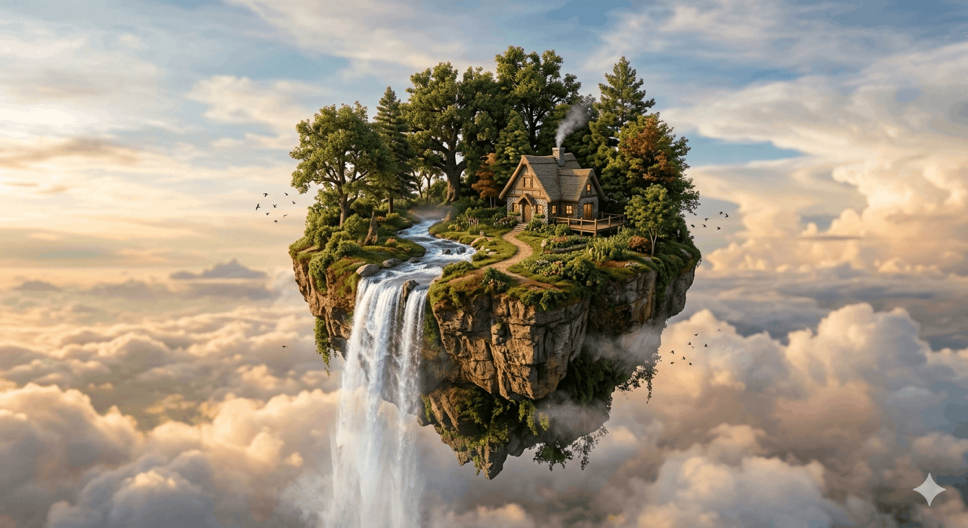 Generate a realistic floating island in the sky with a small house, trees, and a waterfall flowing down. Use cinematic lighting and a soft cloudy background. Maintain realistic textures and perspective.