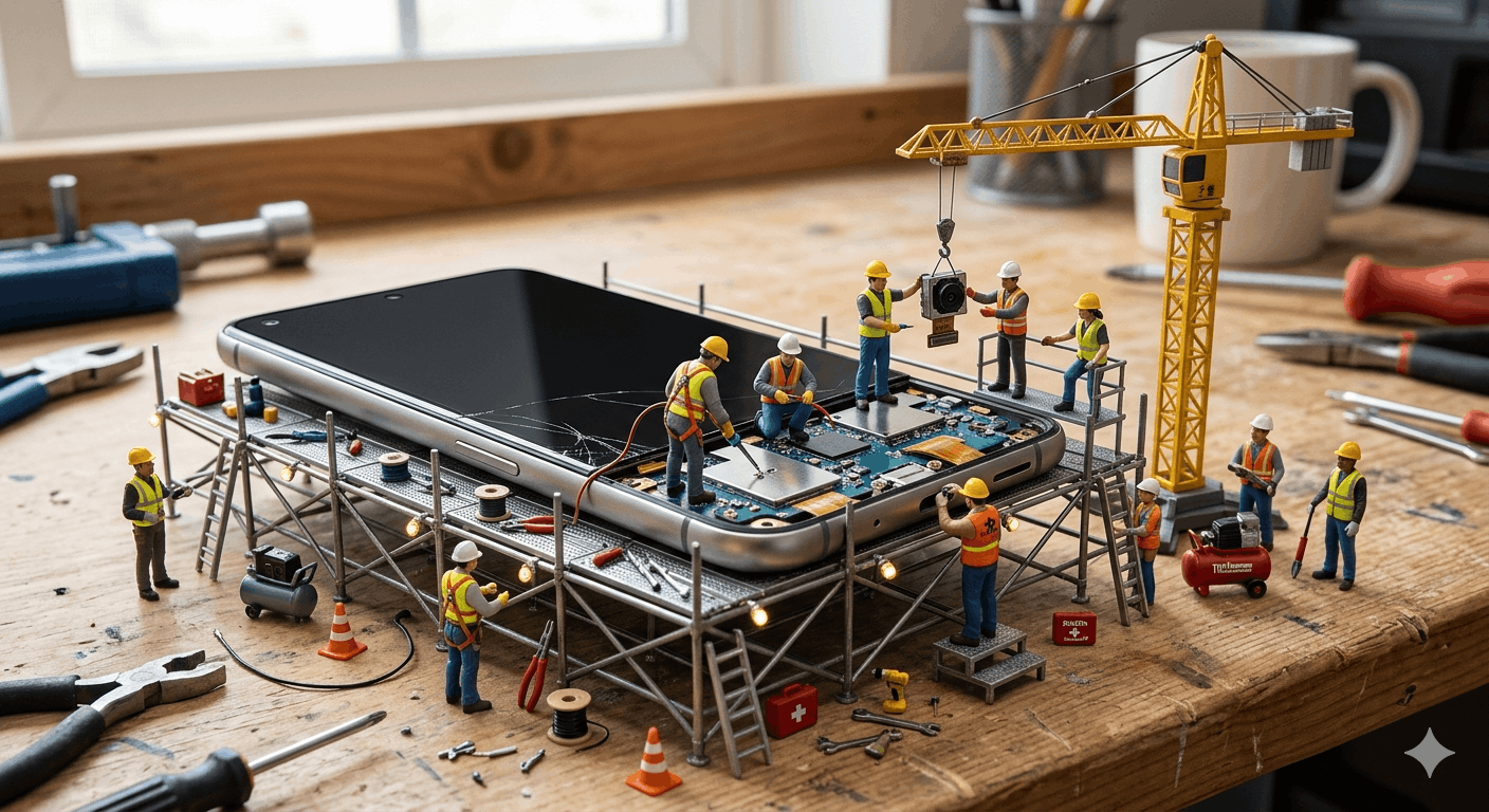 Create a realistic miniature scene of tiny construction workers repairing a smartphone. Include cranes, tools, and safety gear. Use natural lighting and detailed textures. Maintain believable scale and perspective.