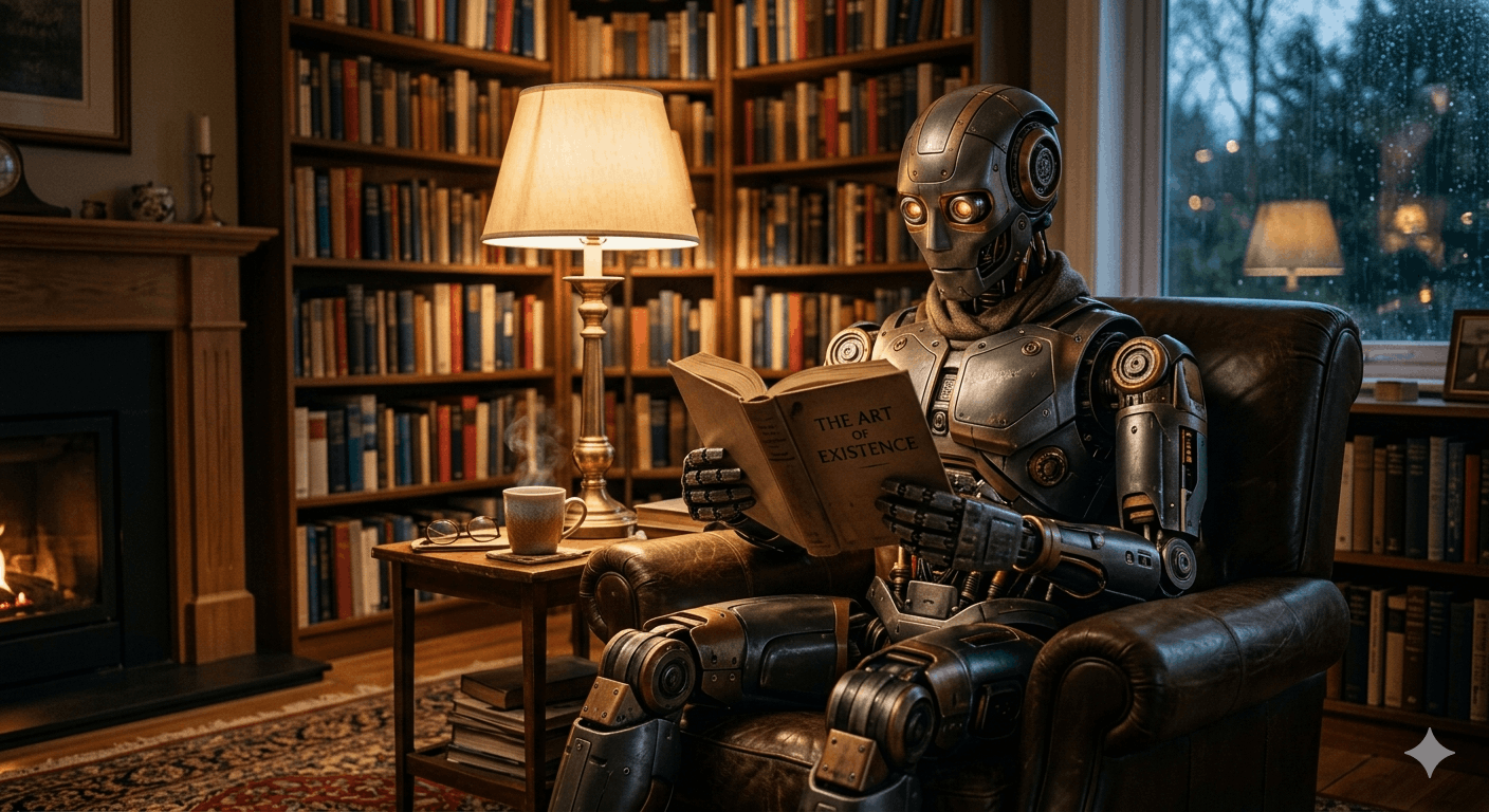 Create a realistic image of a humanoid robot sitting in a cozy room reading a book. Add warm lighting, soft shadows, and detailed textures on the robot. The environment should feel calm and cinematic.